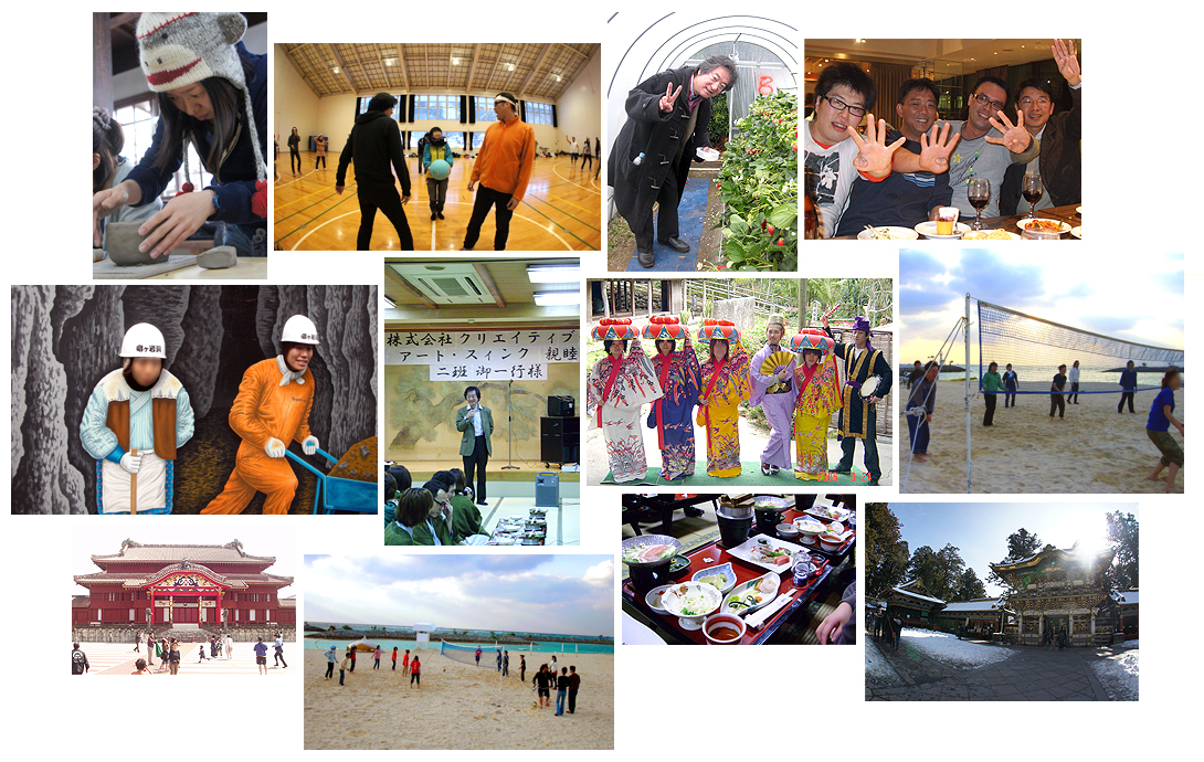 社員旅行では各地の観光スポットを巡ったり、いちご狩りや陶芸体験、ビーチバレーやドッジボールなど
