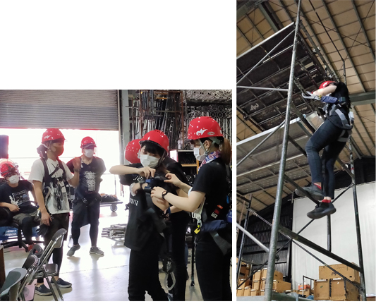 新人に向けてフルハーネスの正しい着用の仕方から、実際に倉庫内にイントレを建てて高所での作業の注意点など実戦形式で学んでいきます。