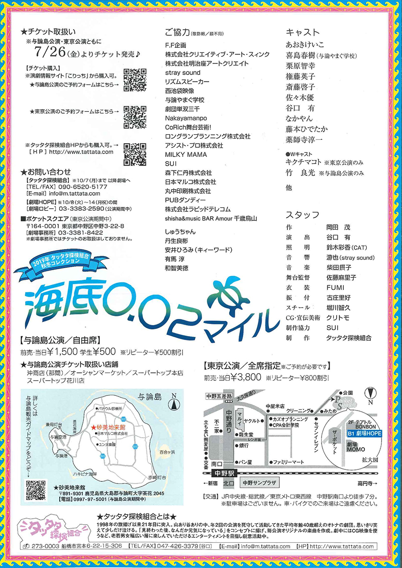 照明:松田かおる ピンチーフ:太田沙友里 美術:中村公一 舞台製作:クリエイティブ・アート・スィンク 加賀谷吉之輔 企画・製作:アスレティック・ミエ・カンパニー/シーエイティプロデュース 主催:シーエイティプロデュース